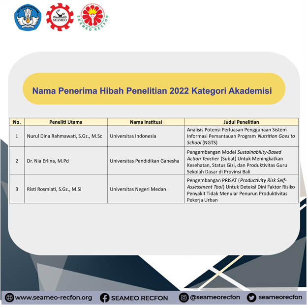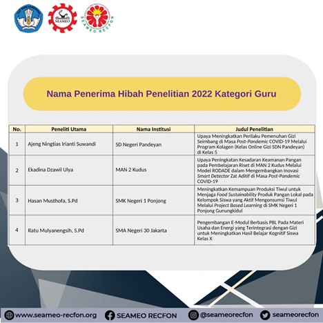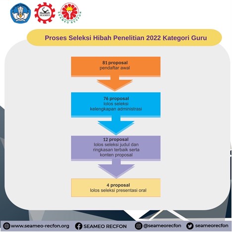SEAMEO RECFON telah menyatakan lolos seleksi bagi 3 tim akademisi dan 4 tim guru dalam Request For Proposal (RFP) Penelitian Kontraktual 2022.