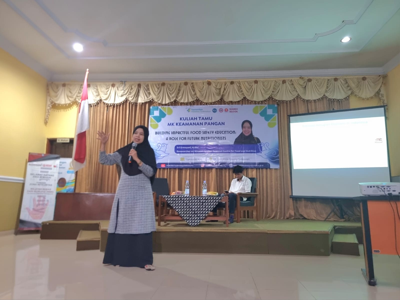 The program kicked off on 11 September 2025, with a guest lecture at the Health Polytechnic of Tasikmalaya titled “Impactful Food Safety Education Program: The Role of Future Nutritionists,” delivered by Evi Ermayani, M.Gz., from SEAMEO RECFON. The session covered the importance of food safety education, behaviour change communication, and the stages of developing educational projects. It concluded with an interactive discussion with nutrition students as part of efforts to reinforce collaboration between the two institutions.